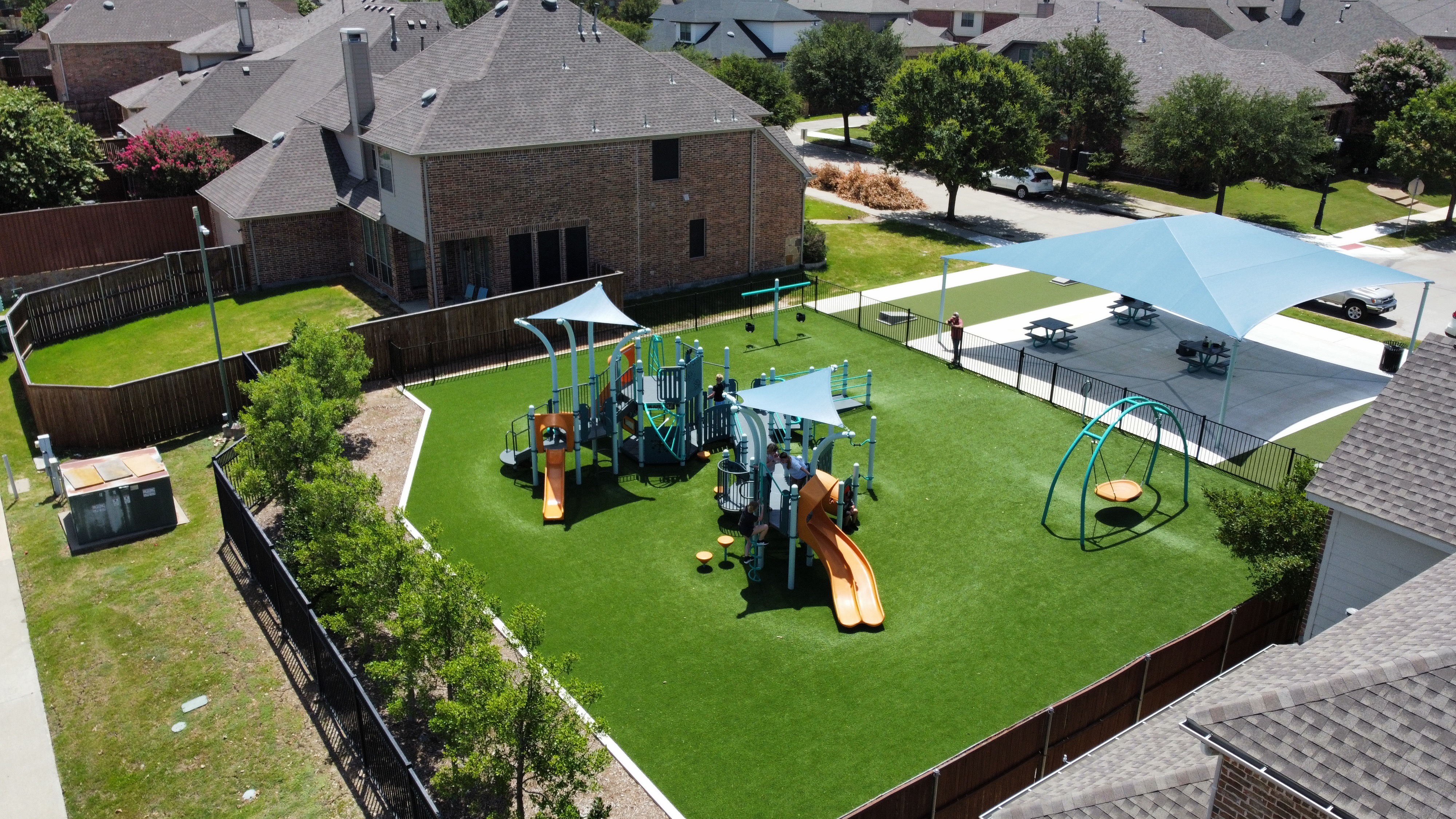 Almsbury Park in Lewisville, Texas is a great example of how this works in practice. As a small neighborhood pocket park, the design incorporates a ramped play structure, accessible low-level activities, and strategically placed shade to ensure comfort and usability. Shaded seating areas allow caregivers to sit comfortably while children play and provide an essential respite for children who are susceptible to heat exhaustion—offering a place to cool down, regulate, and re-enter play at their own pace. Cornhole boards invite older children, teens, and adults to participate, helping transform the park into a truly multigenerational gathering space. Thoughtful perimeter fencing adds an additional layer of safety, particularly for children with autism or others who may be prone to wandering, while still maintaining a welcoming, open feel.